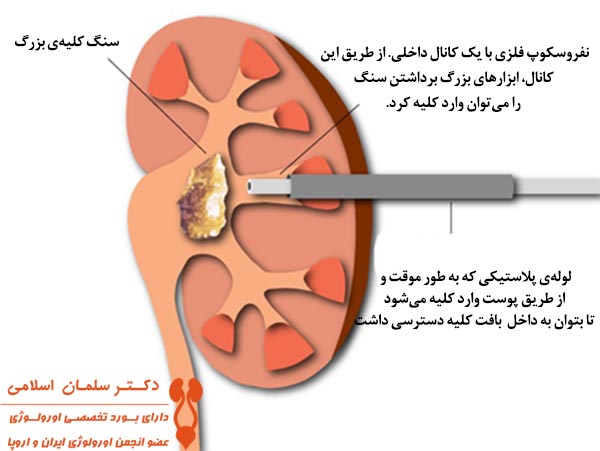سپس، محل وارد شدن سوزن به داخل کلیه منبسط می‌شود به طوری که قطر آن به یک سانتی‌متر می‌رسد و سپس از طریق آن یک لوله پلاستیکی و یک تلسکوپ کوچک وارد کلیه می‌شود و جراح می‌تواند مستقیماً سنگ‌ها را ببیند. در مرحله بعدی، از طریق دستگاه سنگ‌شکن مکانیکی یا لیزر، سنگ به قسمت‌های کوچک‌تر تقسیم می‌شود و از طریق لوله‌ای از کلیه خارج می‌شود. در برخی موارد خاص ممکن است بیش از یک لوله برای بیرون کشیدن سنگ‌ها کار گذاشته شود.